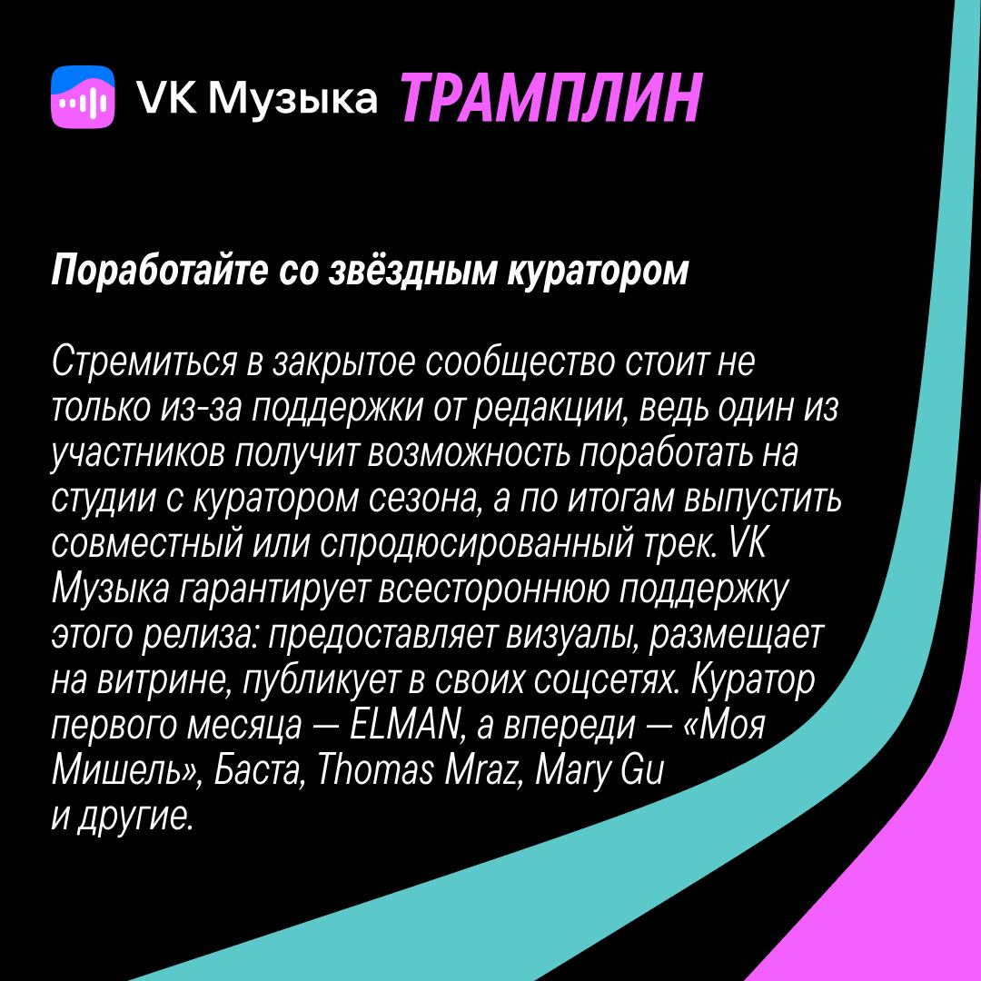 «VK Музыка всегда помогала молодым артистам и продолжает это делать. Раздел и плейлист «Новые имена» много лет стабильно дают прирост прослушиваний новичкам. Активно развивается плейлист «Набирающие популярность» с музыкантами, которые уже сделали первые успехи. Треки артистов, стартовавших в VK Музыке, звучат на радиостанциях, они участвуют в наших промокампаниях, а звучащие ярче всех фрешмены получают приглашение на Фиолетовую сцену VK Fest. Программа «Трамплин» — логичный следующий шаг. В ней мы соберём в единое целое и дополним всё многообразие возможностей VK Музыки и ВКонтакте для молодых музыкантов. Этот проект уникален тем, что в нём артисты получат один из самых действенных инструментов расширения базы слушателей — прямое взаимодействие с уже популярными музыкантами. «Трамплин» поддерживает статус нашей платформы в качестве главного первооткрывателя классных имён на российском музыкальном рынке».