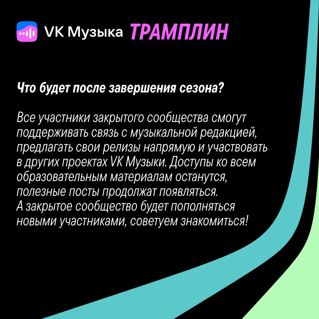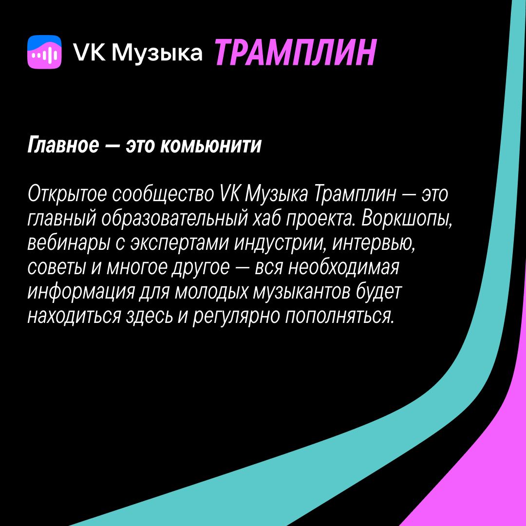 Все самое важное начинающие музыканты могут найти в сообществе «Трамплин». В нём есть посты о том, как набирать слушателей и продвигать новые релизы, там будут проходить вебинары, мастер-классы и воркшопы.